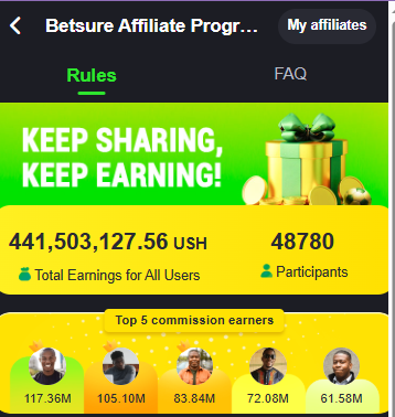 Ugandan affiliates are already making thousands weekly through Betsure’s affiliate system. Top promoters earn impressive weekly commissions simply by being consistent.